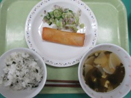 わかめとじゃこのごはん・ポテサラ春巻き・野菜のゆかりかけ・すまし汁・牛乳