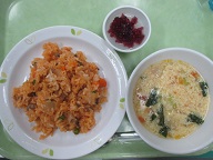 チキンライス・チーズのふわふわトマトスープ・アジサイゼリー・牛乳