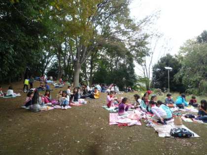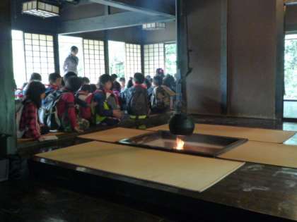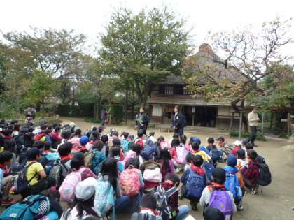 次大夫掘公園に着きました。昔の民家を見学しました。3軒の民家に入って、昔の人たちが、どんな道具を使ってどんな生活をしていたか、係りの人の説明を聞きました。そのあと、公園でお弁当を食べました。
