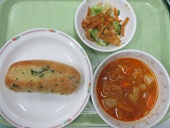 ガーリックフランス・ロシアンシチュー・かりかり豆サラダ・牛乳