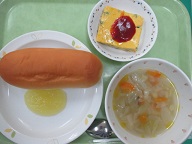 ミルクパン・スペイン風オムレツ・野菜スープ・手作りリンゴジャム・牛乳