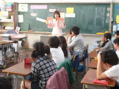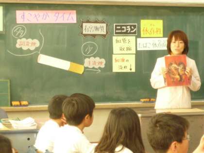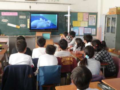 今日の3時間目に、5年4組で「すこやかタイム」を行っていました。先生は養護教諭の菊原先生。タバコの害についての学習でした。タバコを吸うと肺の中が真っ黒くなる実験を、模型と動物実験で行うビデオを見ながら、その危険な様子について、学んでいました。自分の健康のために、何をどうしたらいいのか、子ども一人ひとりが真剣に考えてたばこの害から体を守りましよう。
