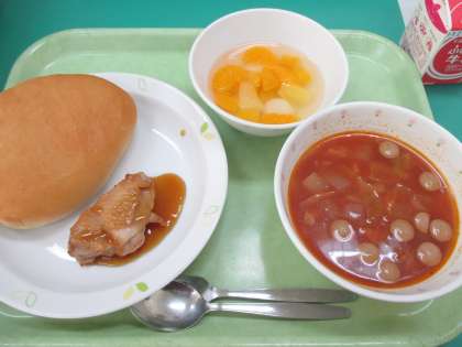 照り焼きチキンバーガー・だいこんdeミネストローネ・フルーツ白玉・牛乳