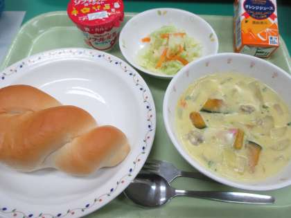 ミルクパン・パンプキンシチュー・サラダ・ヨーグルト・オレンジジュース