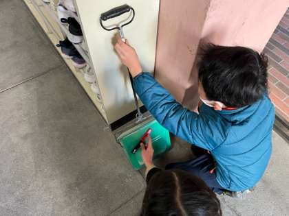 理科の授業で磁石の実験をしています。身近にあるもので、磁石につくものがあることがわかりました。