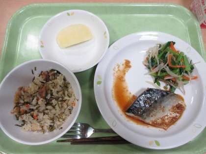 いそおこわ・さばのごまだれやき・おひたし・りんご・牛乳