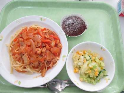 スパゲティイタリア—ノ・キャベツとコーンのサラダ・ガトーショコラ・牛乳