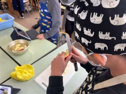 りんごの皮むきをしました。見ている方が、ちょっとドキドキ。上手な子もいました。お家でお手伝いしているのかな。