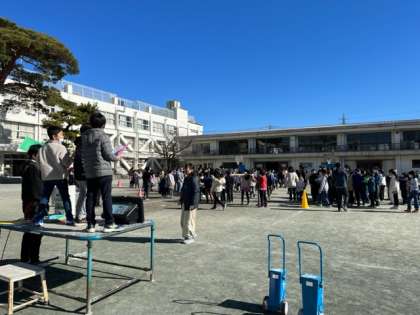 校庭で、クイズやゲームで3・5年生が交流しています。