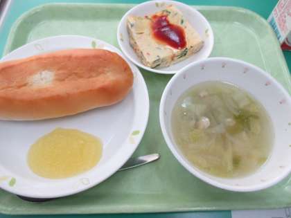 ソフトフランスパン・スペイン風オムレツ・野菜スープ・リンゴジャム・牛乳