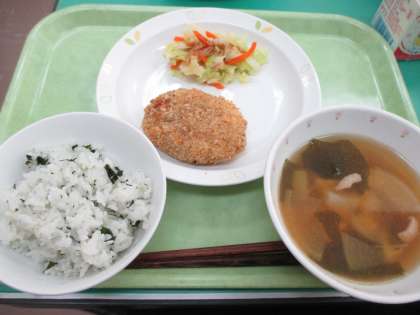 わかめごはん・肉じゃがコロッケ・ボイルキャベツ・けんちん汁・牛乳
