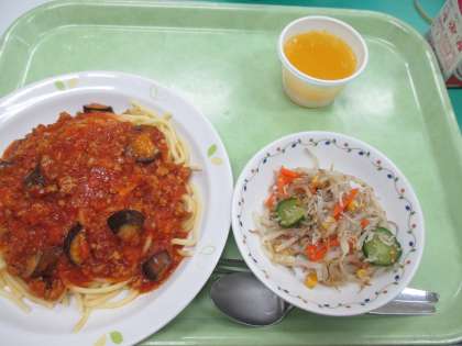 今日のなすのミートスパゲティは、給食委員会の児童が考えた