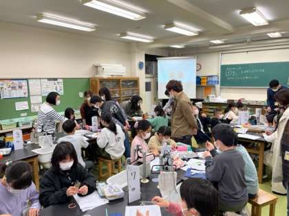 東大CASTの皆さんがきてくださり、磁石と電流について学んでいます。細かく手先を使う作業にたくさんの保護者の方が助けてくださっています。