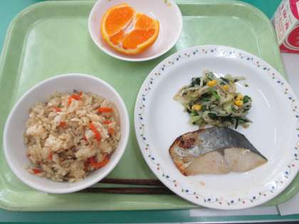 とりめし・さわらの西京焼き・いそあえ・デコポン・牛乳