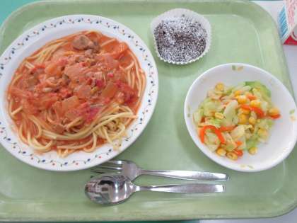 スパゲティトマトクリームソース・コーンサラダ・ガトーショコラ・牛乳