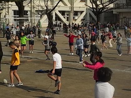 昨日の中休みの時間から、「みんなで跳ぼう」が始まりました。音楽に合わせていろいろな跳び方を5分間、低学年(1,2,3年)の日と高学年(4,5,6年)の日に分けて、取り組みます。今日は、高学年の日で、みんなが校庭に出て縄跳びをしていました。音楽が終わっても友達と二重とびの練習をしたり、縄跳びカードをやっていたり、みんな元気に過ごしていました。
