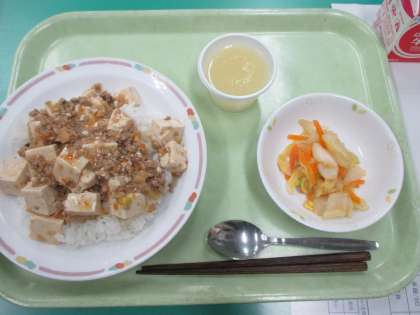 マーボー豆腐丼・白菜のぴりぴり漬け・もものゼリー・牛乳