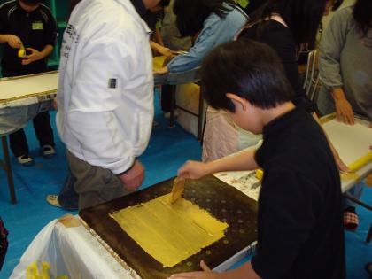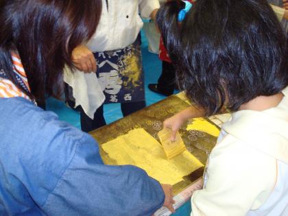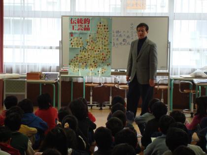 まず初めに、伝統的工芸品についてのお話を聞きました。全国の工芸品はもちろん、東京染小紋の起源について、問題を交えながら分かりやすく説明していただきました。職人の方が実際に作った染小紋の型を手に取って見た子どもたちからは、「おー、きれい!」や「人が作ったと思えないほど細かいよ!」といった驚きの声を聞くことができました。