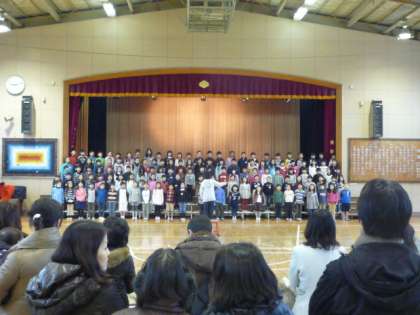 1,2校時3年生が体育館で、学年集会を行っていました。音楽朝会で歌った気に入った歌や演奏を聞かせてくれたり、参加した保護者とスポーツ交流をして楽しいひと時を過ごしていました。お母さん方も小さい時に帰って、はつらつと活動していました。