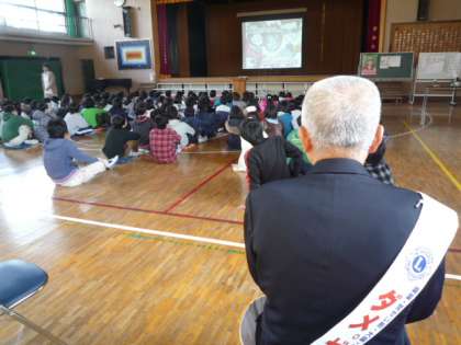 6校時、体育館でライオンズクラブの4人の方がお見えになって、6年生の子どもたちに「薬物乱用防止」についての話をしてくださいました。さまざまな薬物が使用することによって、大切な脳を破壊する恐ろしい原因になっていることをDVDを使って説明をいただきました。「ぜったいにダメ」「ぜったいに許さない」ということをつよくアピールしていました。6年生もしっかり話を聞いていました。
