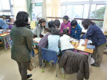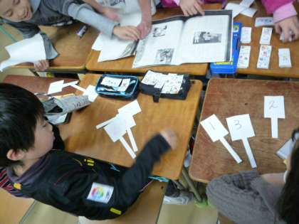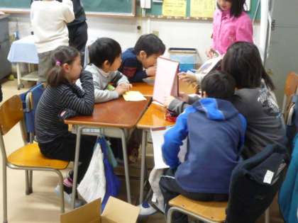 4年1組と1年1組、4年2組と1年2組で、読み聞かせの交流活動が行われました。4年生が1年生に絵本を読んで聞かせ、本の内容に関するクイズを出して、1年生に答えてもらっていました。どのグループも1年生がどんな本を喜ぶか、どんなクイズを出せば盛り上がるか、どんな答え方をさせたら楽しいか、と、4年生が1年生の気持ちを思いながら考え、声かけをしてくれていました。これが、大切にしたいコミュニケーション力です。子どもたちは、場を与えられて、本当に楽しそうに交流できていました。