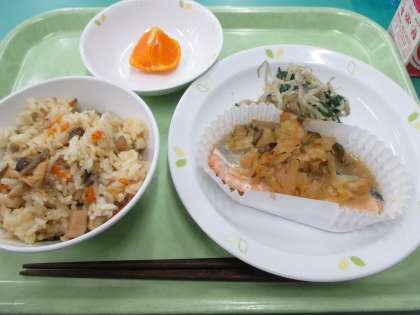 五目ごはん・さけのちゃんちゃんやき・もやしのごま風味・清美オレンジ・牛乳