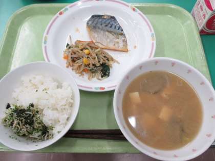 ごはん・さばの韓国風焼き・ごまあえ・さつまじる・ふりかけ・牛乳
