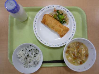 今日はまごはやさしい給食の日でした。3年1組の子どもたちが考えてくれた献立で、特に魚の包み揚げは絶品でした。