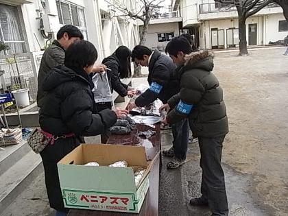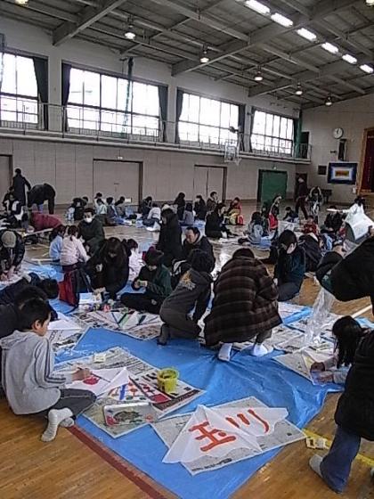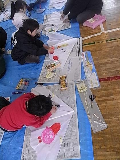 今日、玉川小学校協議会・遊び場運営委員会・おやじの会共催で、たこあげ大会を行ないました。子どもたち70名、保護者60名、役員30名位の人数でした役員の人たちは、、朝9時過ぎから焼き芋用の芋をアルミホイルにくるんだり、薪を運んだり、体育館にブルーシートを準備したり作業を行ないました。10時30分からは子どもたちが体育館で、たこの絵付け作業をしました。