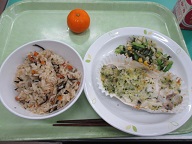 五目ごはん・さけのマヨネーズ焼き・いそあえ・冷凍みかん・牛乳