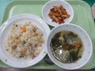 チャーハン・やさいたっぷりわかめスープ・キャラメルポテト(黒糖あじ)・牛乳