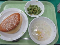 焼きカレーパン・きゃべつと豆乳のスープ・青のりポテトビーンズ・牛乳