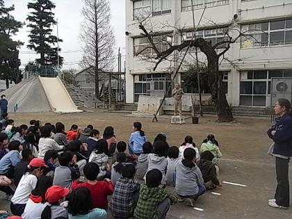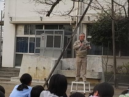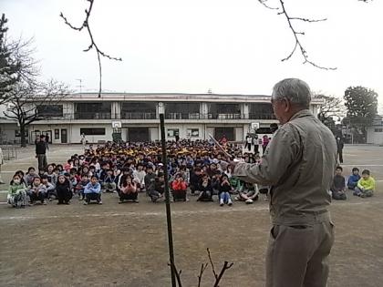 今日の全校朝会に、樹木医の飯島先生がお見えになって、植え替える3本の桜について子どもたちにわかりやすく説明してくださいました。樹齢が60年以上もたって、大風やボールが当って枝が落ちて危険なことが何回かあったので切ることになったことや、次に植える木は今の木の枝を取木して育てた後継樹であることなどのお話をしてくださいました。「これから花が咲くのになぜ今切らなければならないの?」という質問に、「この時期は大きな桜の木はまだ眠っているし、新しい木にとって春を迎えて根付きやすいので、この時期が一番いいのです。」というお話でした。6月の学校だよりでお知らせして、取木が育つまで期間が長かったですが、いよいよ世代交代となります。
