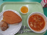チキン照り焼きバーガー・ロシアンシチュー・みかんゼリー・牛乳