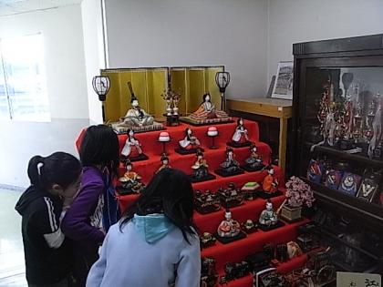 「わっ、きれい!」「えっ、先生たちや主事さんが作ったの?」「家のものより、大きい!」と感動していました。実は、このひな人形は、3年前、日座校長先生が中心になって、夏休みの間に職員と一緒になって作り上げた手作りのひな人形です。当時の先生方に聞くと、「着物を張り合わせるのが大変だった。」「首が思うように中に入らなくて、首長になってしまって、」と、懐かしがっていました。来校の節は、是非ご覧下さい。