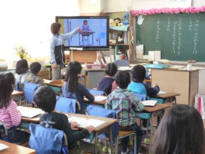 1組では、テレビ画面を活用して、いい姿勢の仕方を学んでいました。子どもたちは、いすにしっかりと座って、先生の話をしっかり聞いていました。足も床にしっかりとつけて座ることができています。