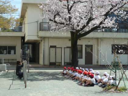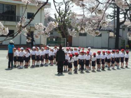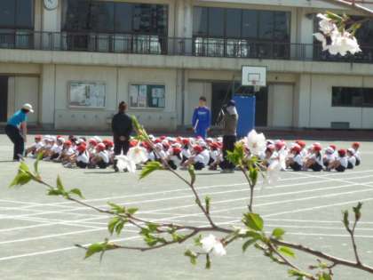 かわいい1年生が、校庭で初めての体育の授業を行っていました。どの学級も先生の言うことをしっかり聞いて、きちんと整列したり、体育座りをすることができていました。とても立派です。鉄棒の順番もしっかり座って待っていることができました。すごい!校庭の桜の花が満開でした。