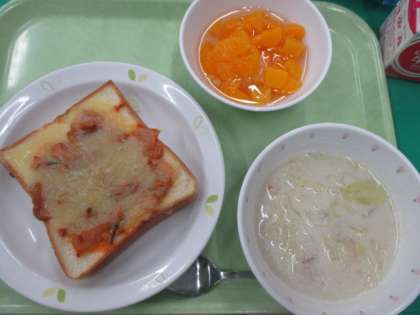 ツナとトマトのトースト・きゃべつの豆乳スープ・フルーツポンチ・牛乳