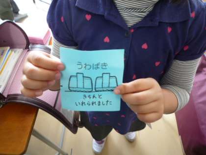 1年3組の教室の子どもたちの様子を見ていたら、一人の女の子が「校長先生、見てください。これ、先生にもらったんだ。靴箱のくつの中に入っていたの!」とうれしそうに報告してくれました。1年生のくつの入れ方がとても上手になっている理由が分かりました。