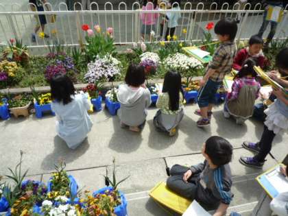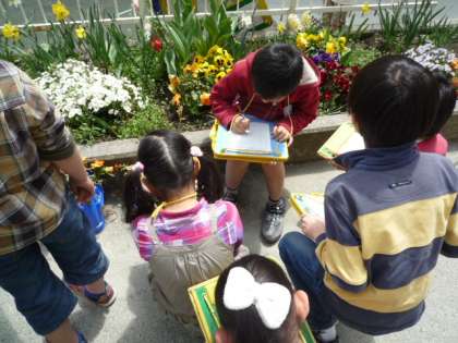 初めての理科の授業で、校庭にある春を子どもたちが一生懸命見つけて、記録していました。
