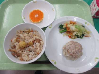 あきのかおりごはん・じゃんぼしゅうまい・やさいの和え物・みかん・牛乳