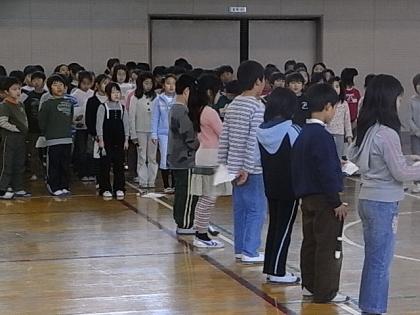 今日、体育館で1時間目に2年生(上の写真)が、3時間目に3年生(下の写真)が、日頃お世話になった6年生に向けての「送る会」のために、学年の出し物の練習をしていました。3月3日の「6年生を送る会」は、5年生以下の代表委員会の児童が中心となって、玉川小の下級生が計画した、いわば手作りの「卒業式」です。全校児童が心を込めて、委員会活動やクラブ活動でリードしてくれた6年生、さまざまな行事で働いてくれた6年生に対しての感謝の気持ちを表す会です。それぞれの学年が感謝の気持ちで6年生を送り出すために、一生懸命準備しているところです。当日が楽しみです。