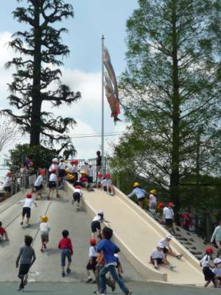 端午の節句を控え、力山に鯉のぼりが泳ぐようになりました。晴天の中、子どもたちの元気に遊ぶ姿と鯉のぼりがとてもマッチしています。