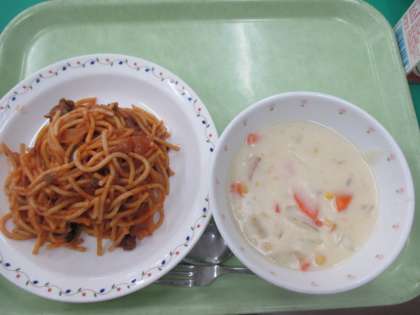 なすときのこのナポリタン・コーンシチュー・牛乳