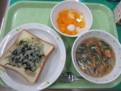 じゃこマヨトースト・春雨スープ・フルーツ白玉・牛乳