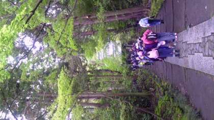 鶴ヶ丘八幡宮に着きました。たくさんの学校が遠足に来ています。八幡宮から源氏山に登り、グループハイキングをしました。日頃の行いがよいせいか、雨がぜんぜん降らない、絶好の山歩き日和です。