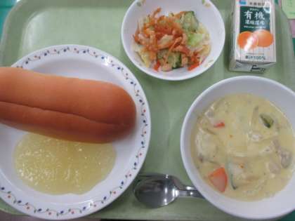 パン・パンプキンシチュー・カリカリまめサラダ・リンゴジャム・有機オレンジジュース