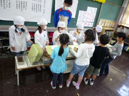 久しぶりに1年生の給食の様子を見て見ようと、教室に行きました。びっくりです。どの教室も、給食当番の子どもたちが自分の分担をしっかりこなして、よそったり、お盆に載せたりしてくれています。班の名前が呼ばれるまで、待っている子たちも静かに椅子に座ることができています。今年の1年生は、とても立派です。