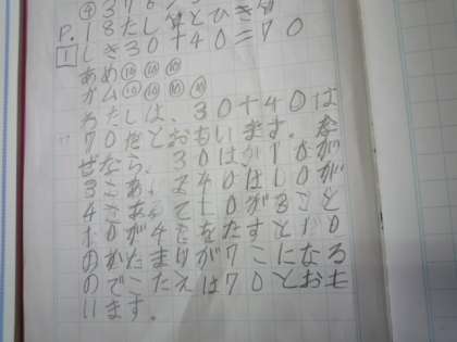 2時間目に2年2組の算数の授業を覗いてみました。30+40の計算の考え方を考えて、みんなに発表する授業でした。それぞれが、今までの学習したことを使って、友だちに分かりやすく説明している姿に感動しました。さらに、ノートを見てみると、発表していない子でも、写真のように自分の考えを順序立ててしっかり書いている子を発見しました。去年までの国語の授業が生きているのか、順序立てて考えをまとめようとする力がたくさんの子たちについているようです。うれしくなりました。