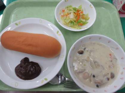 ミルクパン・さつまいものシチュー・きゃべつのサラダ・ココアクリーム・牛乳